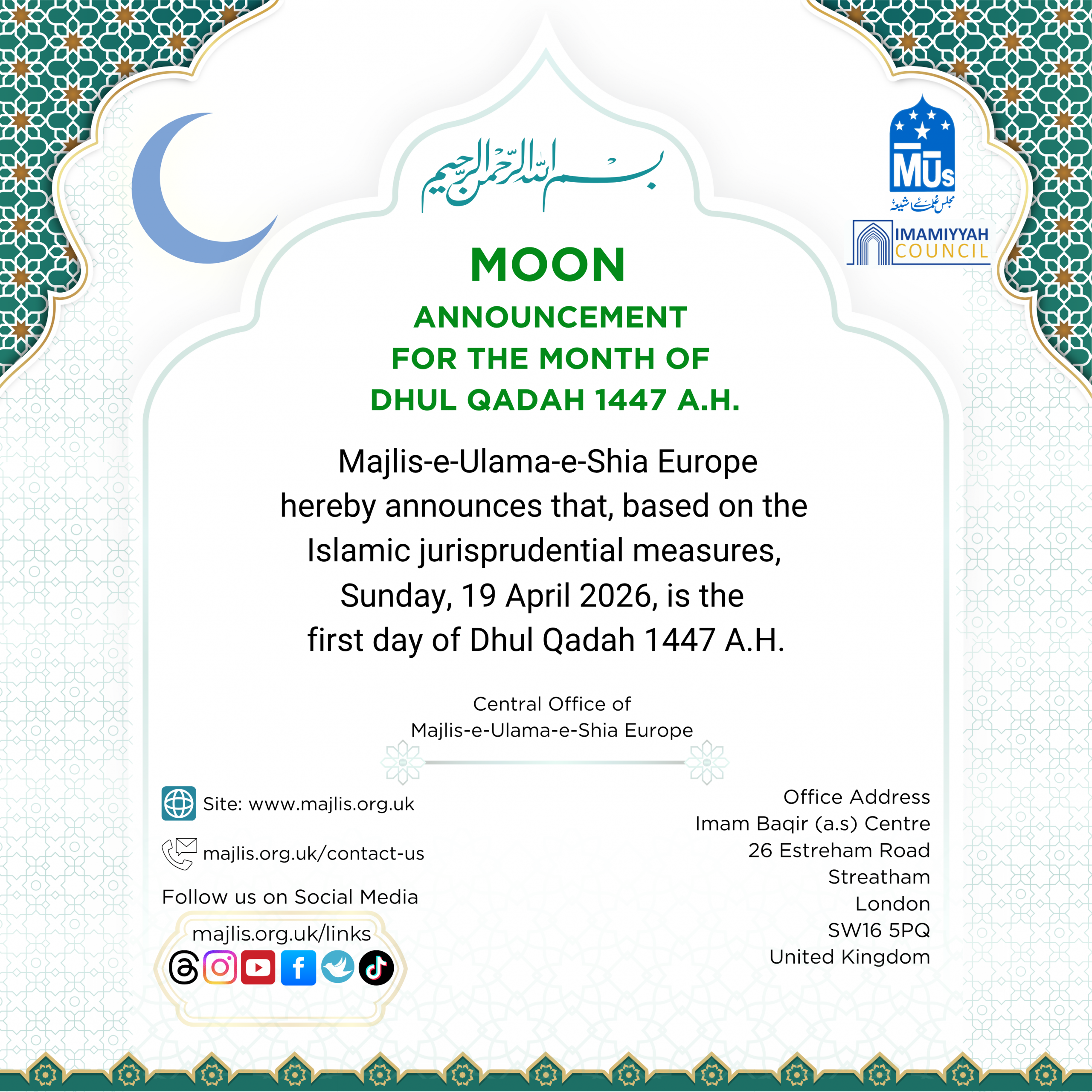 MAJLIS-E-ULAMA-E-SHIA EUROPE Charity number: 1173167 | Imam Baqir (a.s) Centre, 26 Estreham Road, Streatham, London SW16 5PQ, UK |Tel: 01344531398
